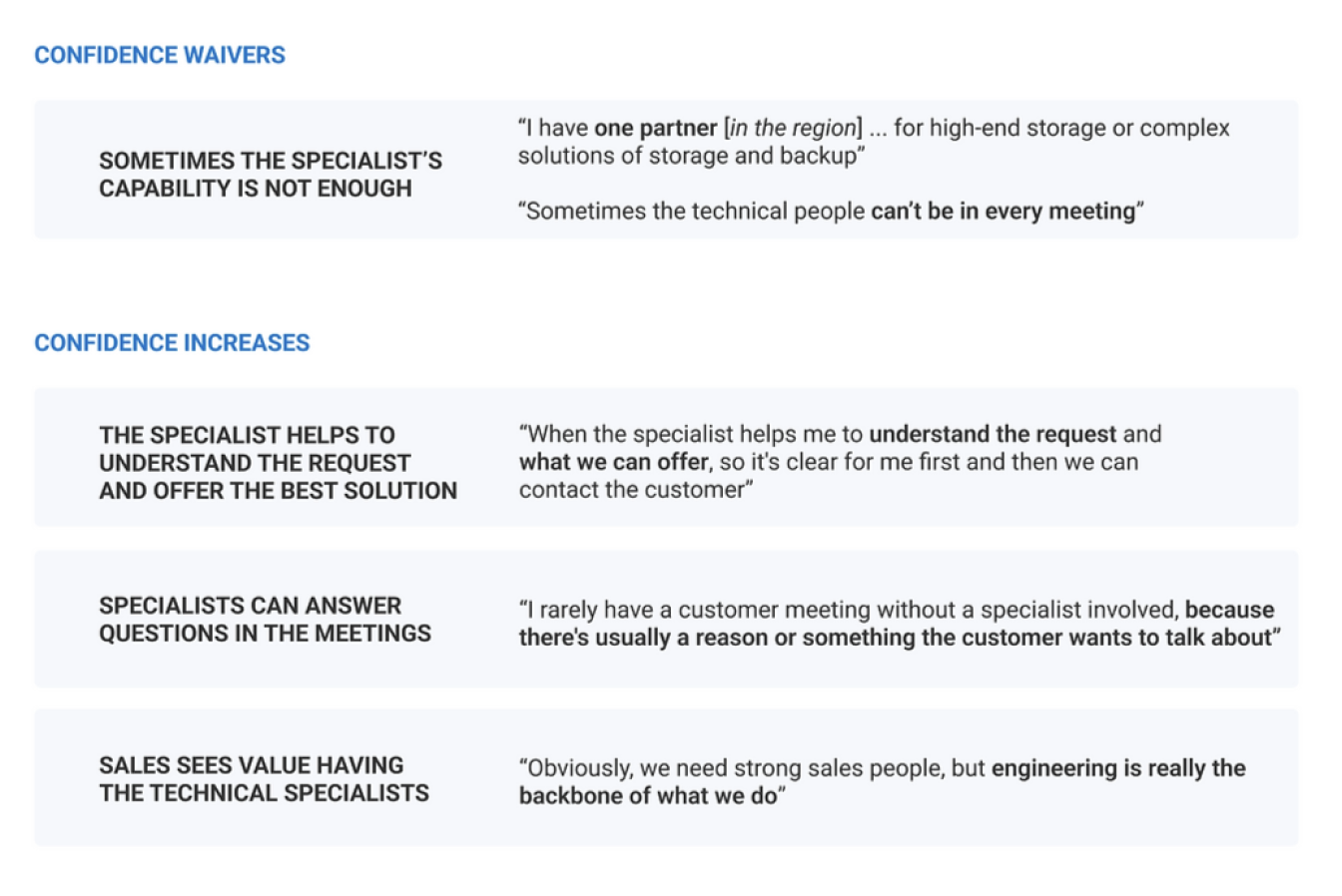 Confidence increase by over 38% after talking to a specialist. By nature, salespeople are very confident individuals. However, when faced with a technical or complex sales opportunity, a specialist is oftentimes needed.