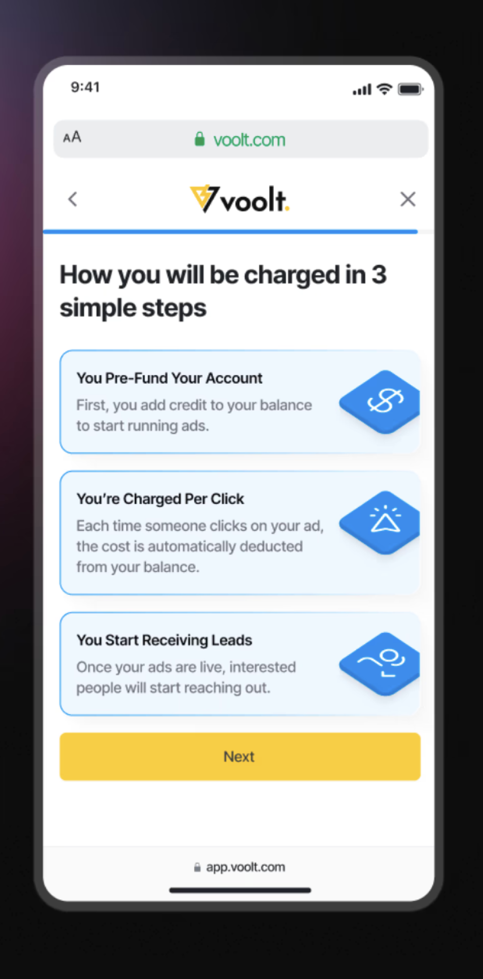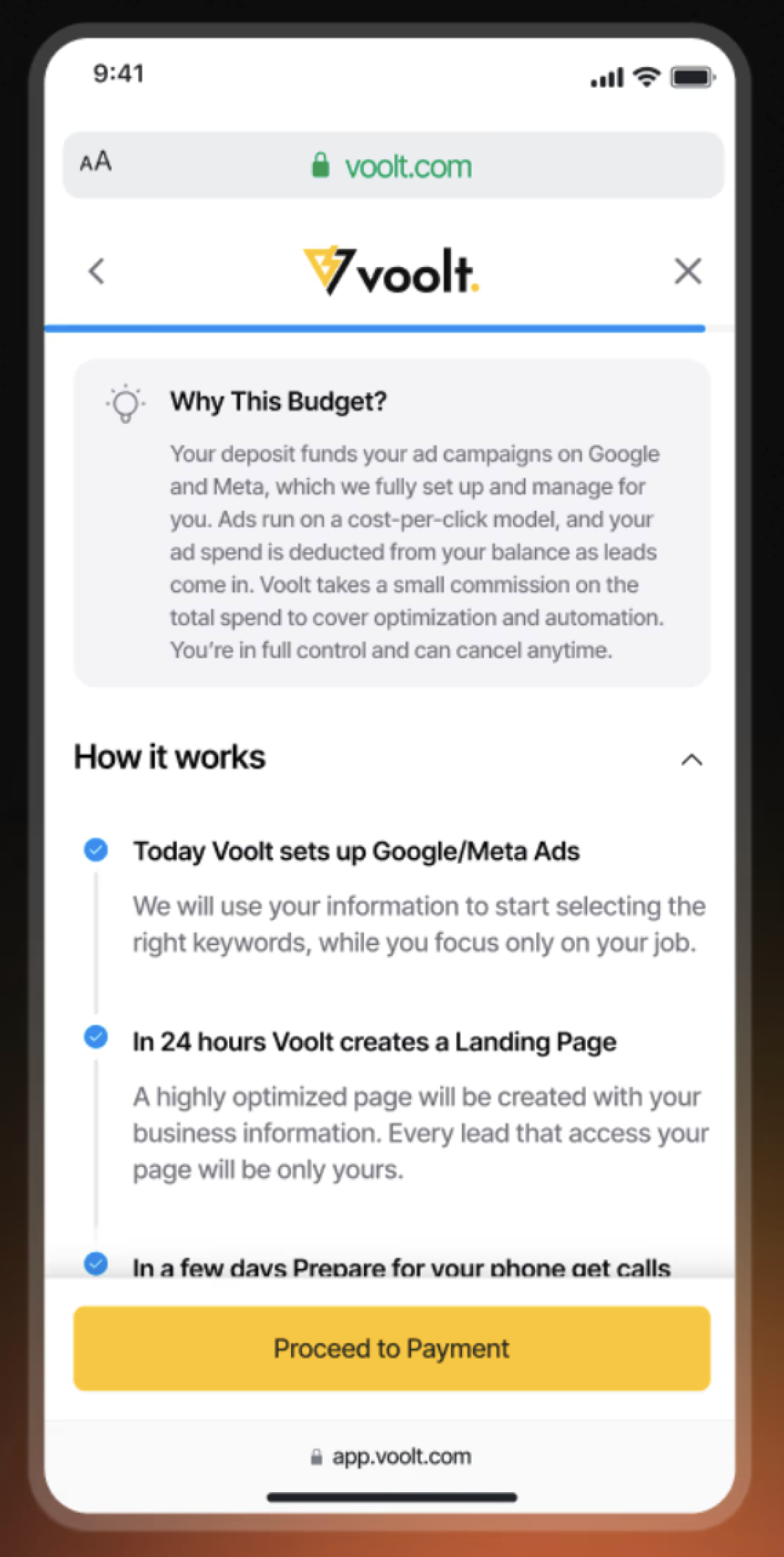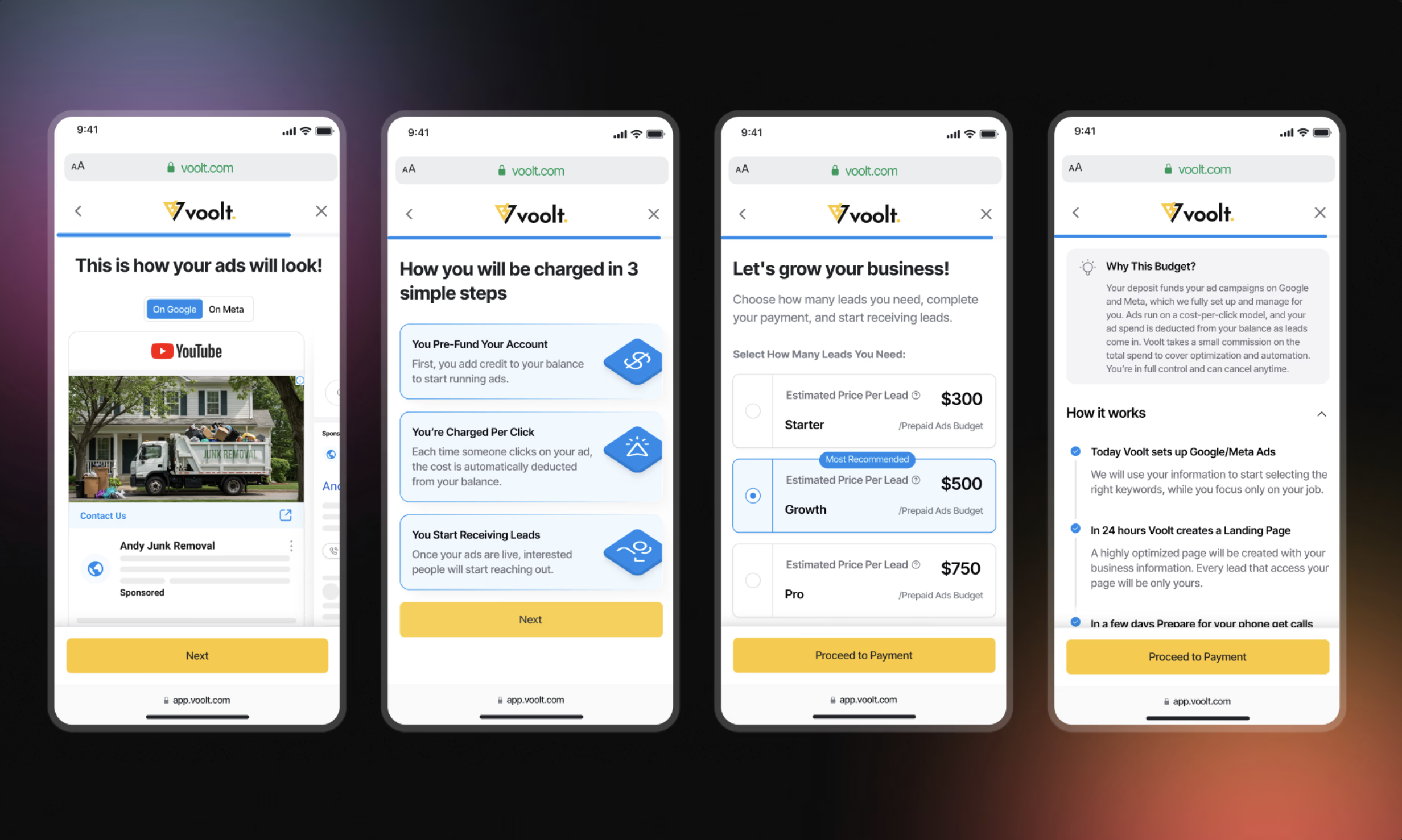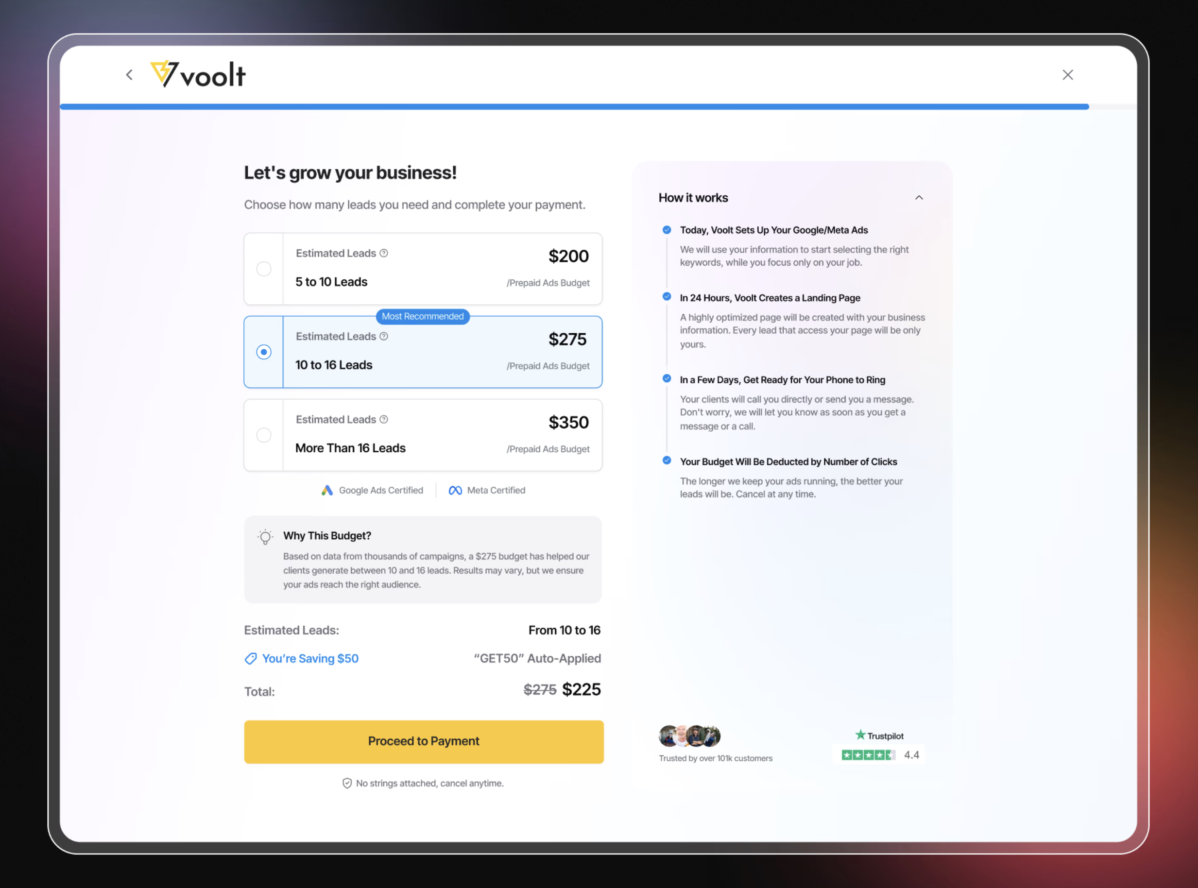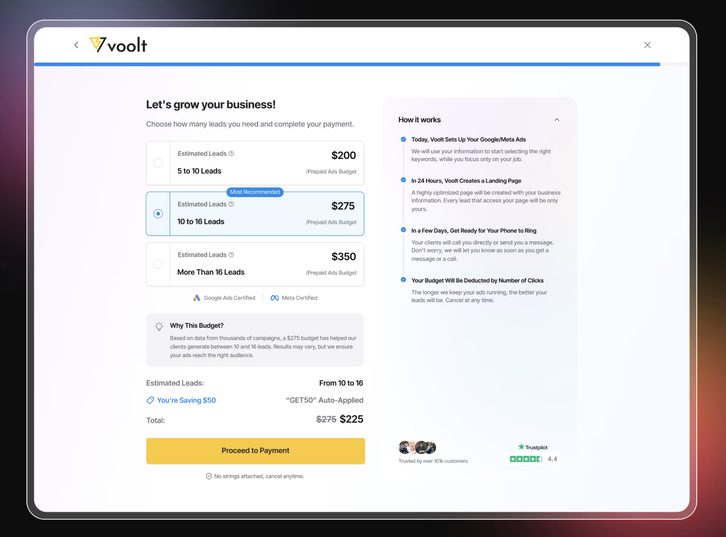 Voolt empowers contractors to launch Google and Facebook ad campaigns effortlessly. The Design team of two handled from creating landing pages, setting up ads, and delivering leads phases of the tool.