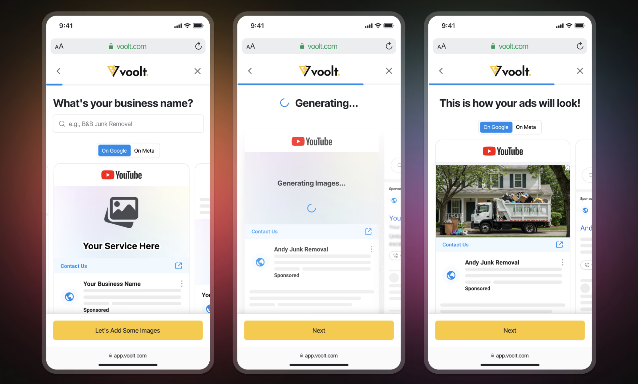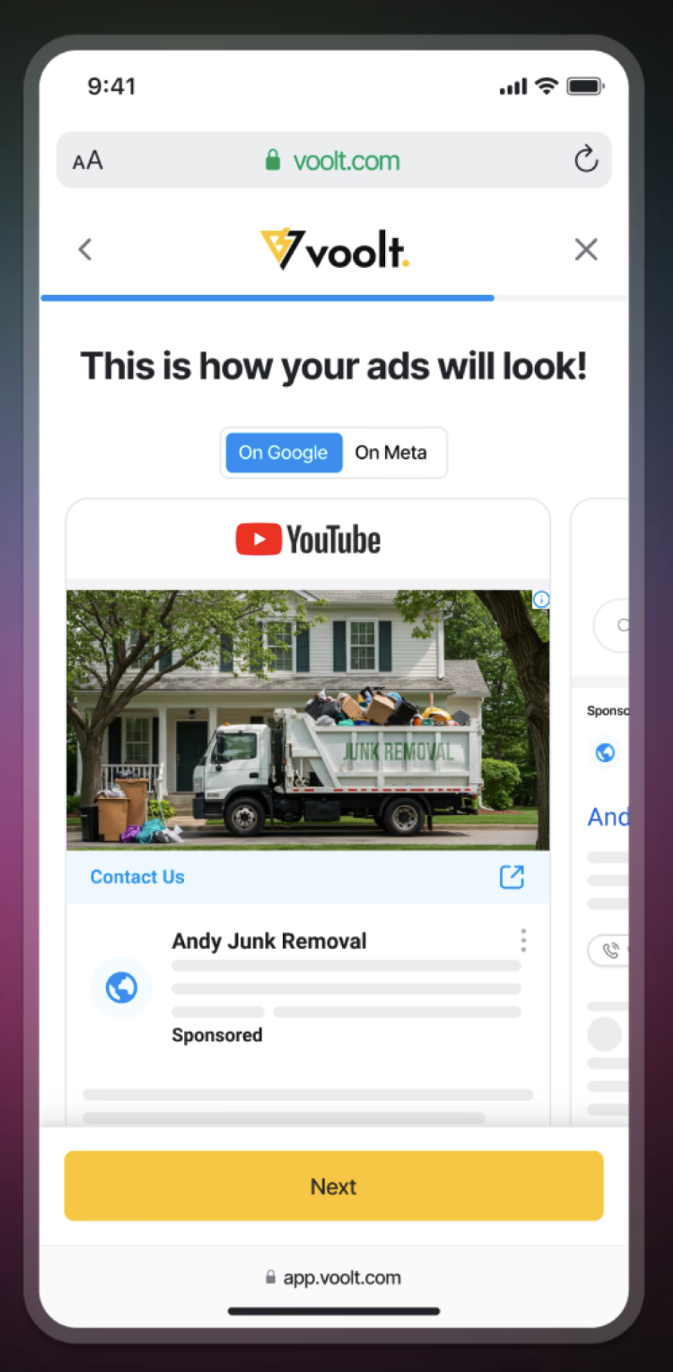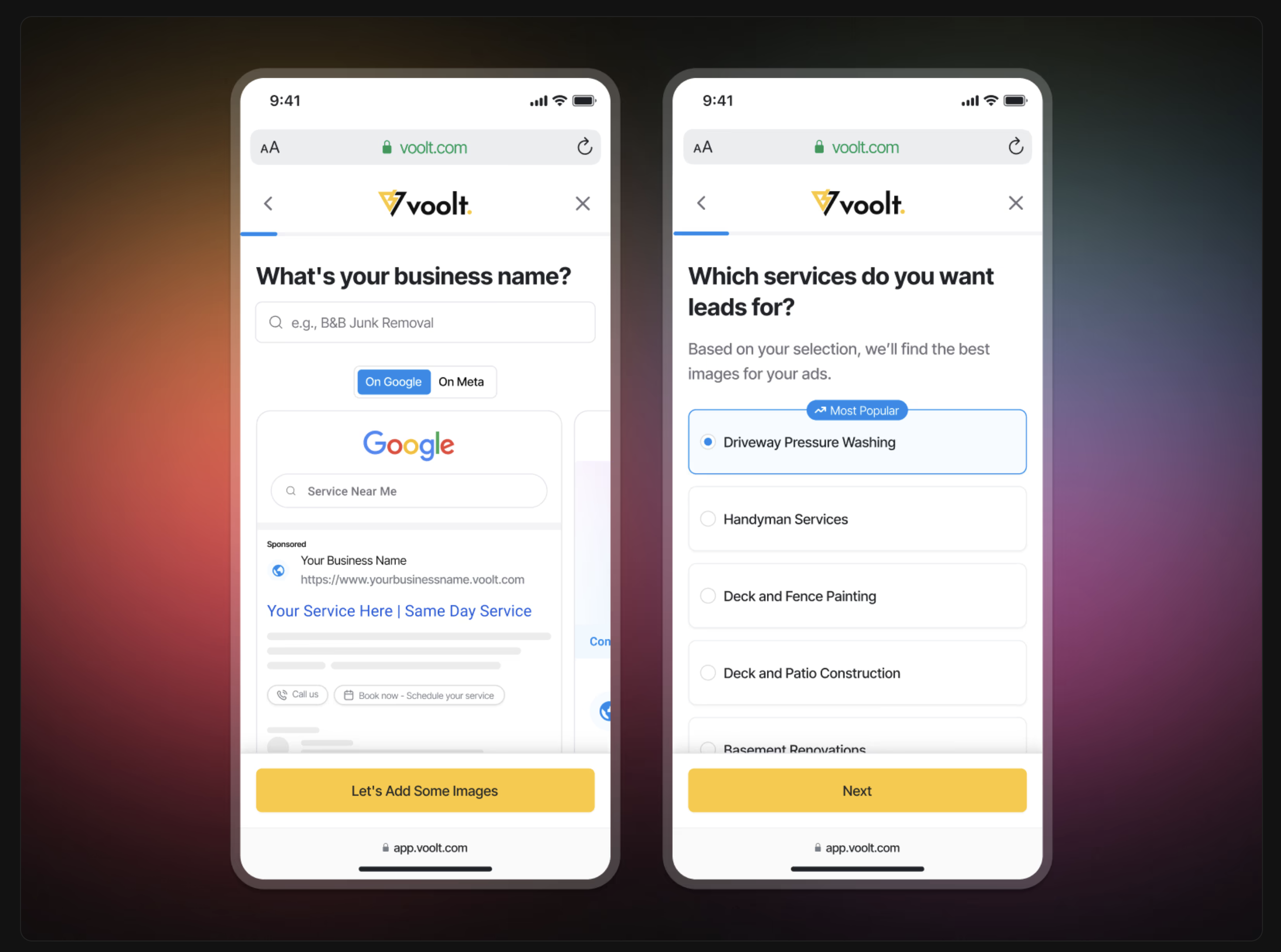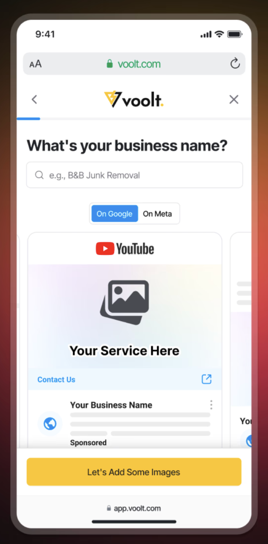 As users input their business information, live ad previews update dynamically. Real images are added based on their industry. The more they fill out, the more personalized it becomes.